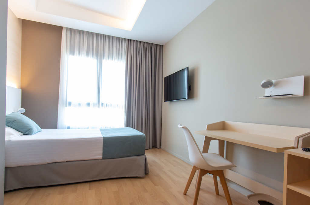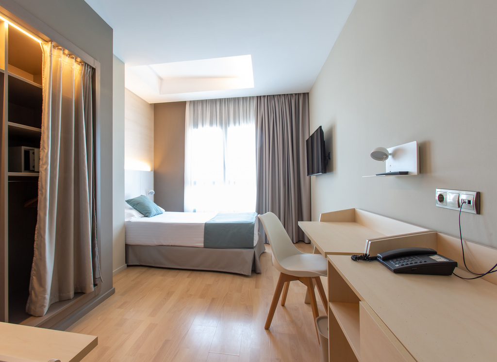 Habitación de tamaño menor, para personas que viajan solas, con cama de tamaño individual (105 cm). Completamente equipada: •Smart TV 43" •Conexión WIFI Gratuita •Enchufe USB para cargar dispositivos móviles •Escritorio con soporte para tablets y dispositivos. •Aire acondicionado •Calefacción •Caja fuerte •Teléfono directo •Minibar